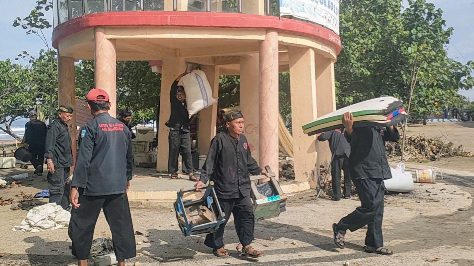 Petugas dari Satpol PP dan Jaga Lembur Membersihkan Lokasi Pos Pemantau di Pantai Barat Pangandaran.(M Jerry/KP).
