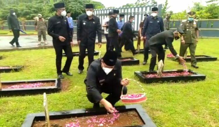PANGANDARAN-Dalam rangka memperingati Hari Pahlawan tahun 2021, Bupati Pangandaran beserta jajaran pemerintah, DPRD, Forkopimda, Ormas Pemuda Pancasila dan yang lainnya, melaksanakan ziarah dan tabur bunga di Taman Makam Pahlawan yang berada di Desa Cintakarya setelah melaksanakan Upacara Bendera Hari Pahlawan, Rabu, 10 November 2021.
