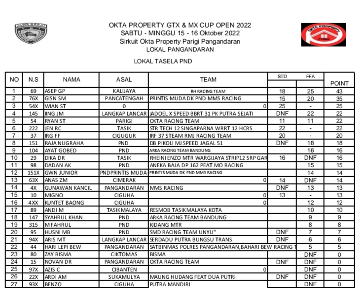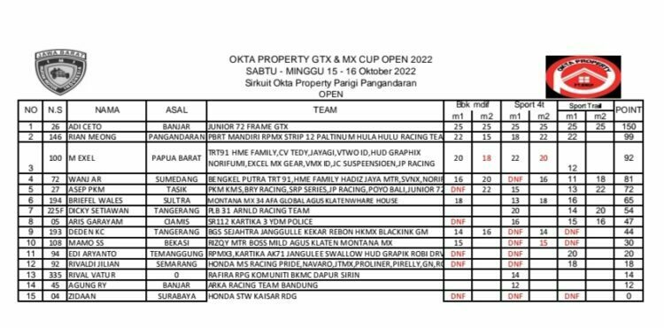 Berikut ini hasil Kejuaraan Motocross & Grasstrack Okta Property Cup Open 2022 dalam rangka menyambut Satu Dasawarsa Kabupaten Pangandaran.
