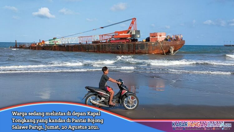 PARIGI-Akibat dari kondisi alun dan angin cukup tinggi hingga terputusnya tali pengikat antara kapal dengan tongkang yang akhirnya terbawa hanyut oleh gelombang ke pinggir pantai tidak jauh dari Pelabuhan Bojong Salawe Parigi, kini kapal tongkang naas tersebut jadi tontonan warga setempat, Jumat, 20 Agustus 2021.