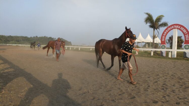 KABARPANGANDARAN – Kejuaraan Nasional Pacuan Kuda Susi Air Cup Nusantara Derby 2022 Round I dengan peserta dari 8 Provinsi di Indonesia oleh panitia penyelenggara disediakan hadiah pembinaa ratusan juta rupiah dan tropy,begitu juga 102 ekor kuda kelas nasional akan bertanding di Gelanggang Pacuan Kuda Legokjawa Cimerak Pangandaran, Jumat, 29 Juli 2022.