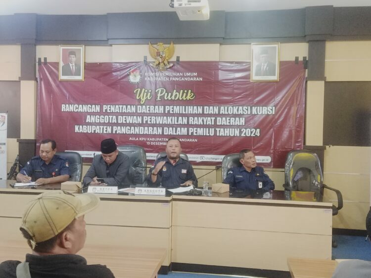 KABARPANGANDARAN – Komisi Pemilihan Umum Kabupaten Pangandaran melakukan uji publik terhadap dua usulan rancangan penataan daerah pemilihan (dapil) dan alokasi kursi anggota DPRD Kabupaten Pangandaran untuk Pemilu 2024.