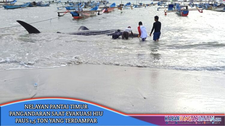 Pengurus Pokmaswas Desa Pangandaran Eka Rohanda (41) mengatakan ikan hiu paus atau hiu tutul yang terdampar ke pinggir pantai timur Pangandaran telah di evakuasi oleh beberapa nelayan ke tengah laut.