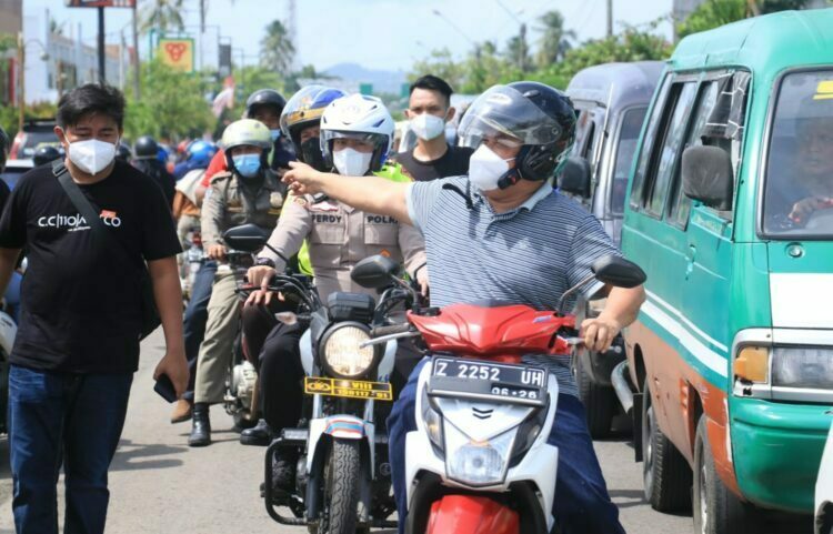Bupati Jeje Wiradinata menggunakan sepeda motor untuk memantau ke lapangan tepatnya di Ujung Tolgate Pantai Barat Pangandaran.
