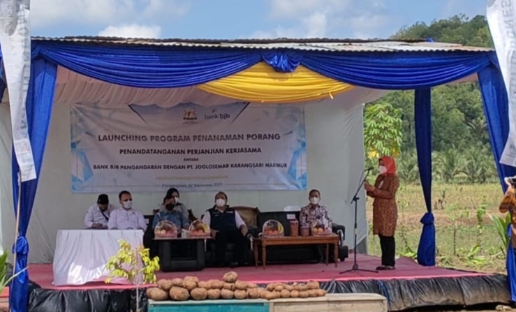 KADIN Pangandaran,Bank bjb dan PT Joglosemar Karangsari Makmur Semarang menggelar Launching Program Penanaman Porang dan Penandatanganan Kerjasama dengan dihadiri Bupati Pangandaran Jeje Wiradinata,Perwakilan CEO Bank bjb Kanwil III Jabar,Manager PT Joglosemar Karangsari Makmur,Ketua Kadin Pangandaran,Ketua MPC Pemuda Pancasila,Ketua DPD KNPI Pangandaran,Petani Porang dan para tamu undangan bertempat di Cikubang Parigi.