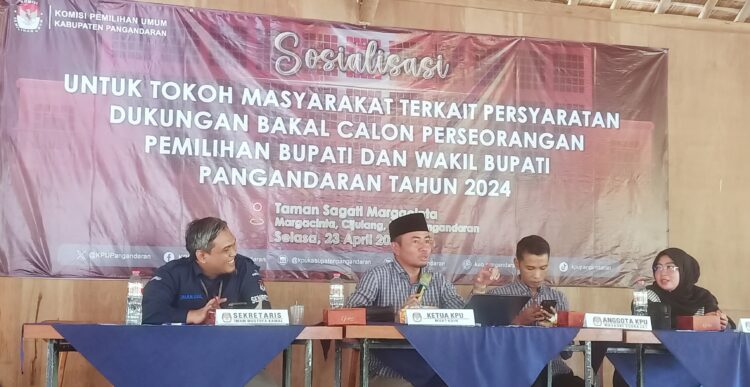 KABAR PANGANDARAN – Komisi Pemilihan Umum (KPU) Kabupaten Pangandaran menggelar Sosialisasi untuk tokoh masyarakat terkait persyaratan dukungan bakal calon perseorangan Pemilihan Bupati dan Wakil Bupati Pangandaran 2024 di Aula Taman Sagati Cijulang Pangandaran, Selasa,23 April 2024.