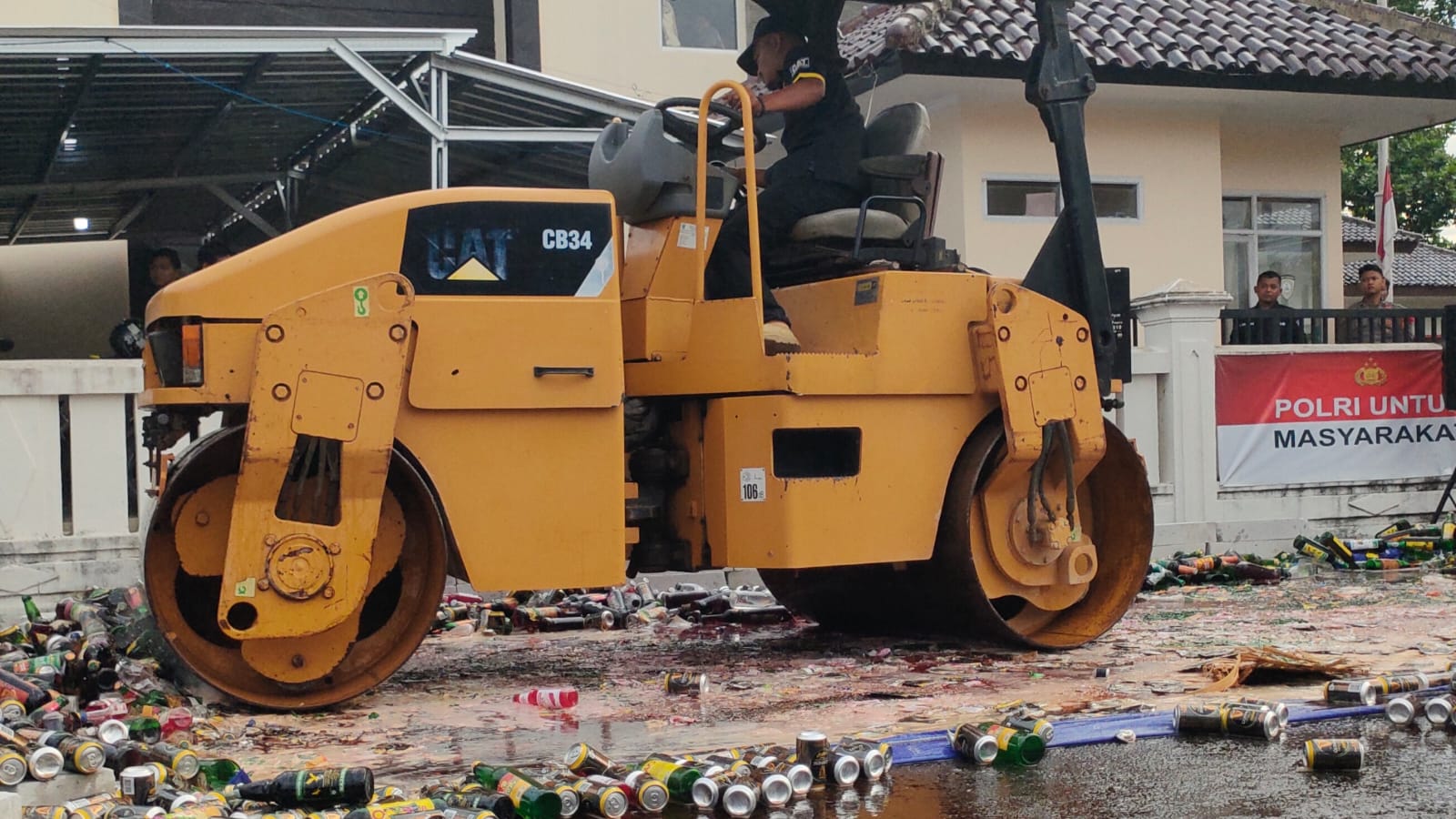 KABAR PANGANDARAN – Polres Pangandaran bersama Forum Koordinasi Pimpinan Daerah (Forkopimda) Kabupaten Pangandaran menggelar pemusnahan 2.086 botol minuman beralkohol hasil sitaan dari operasi cipta kondisi. Pemusnahan dilakukan di halaman Mapolres Pangandaran dengan menggunakan tandem roller.Kamis,20 Maret 2025.