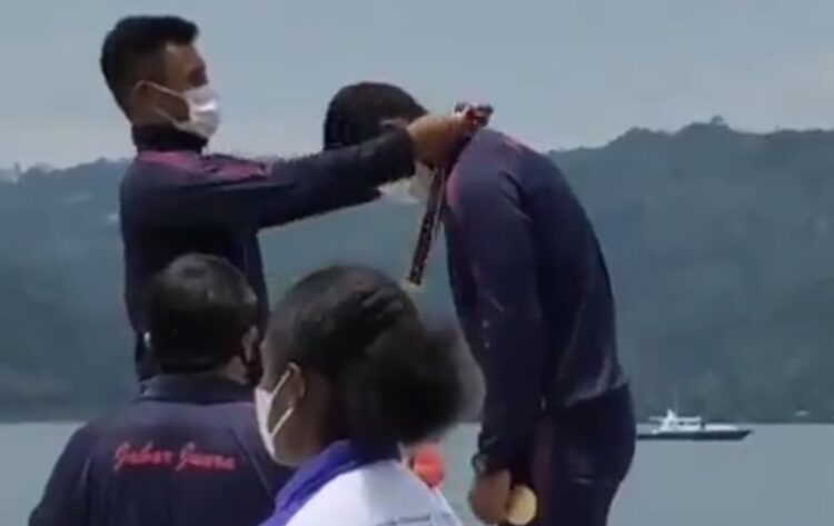 Melansir dari akun twitter PON XX 2021 Papua tampak pada video Ketua Umum KONI Jawa Barat Brigjen TNI PURN H Ahmad Saefudin menyerahkan medali emas kepada atlet dayung Indra Hidayat/Agus Mulyana yang telah berhasil menyumbang emas pertama bagi kontingen Jawa Barat di cabang olahraga dayung.