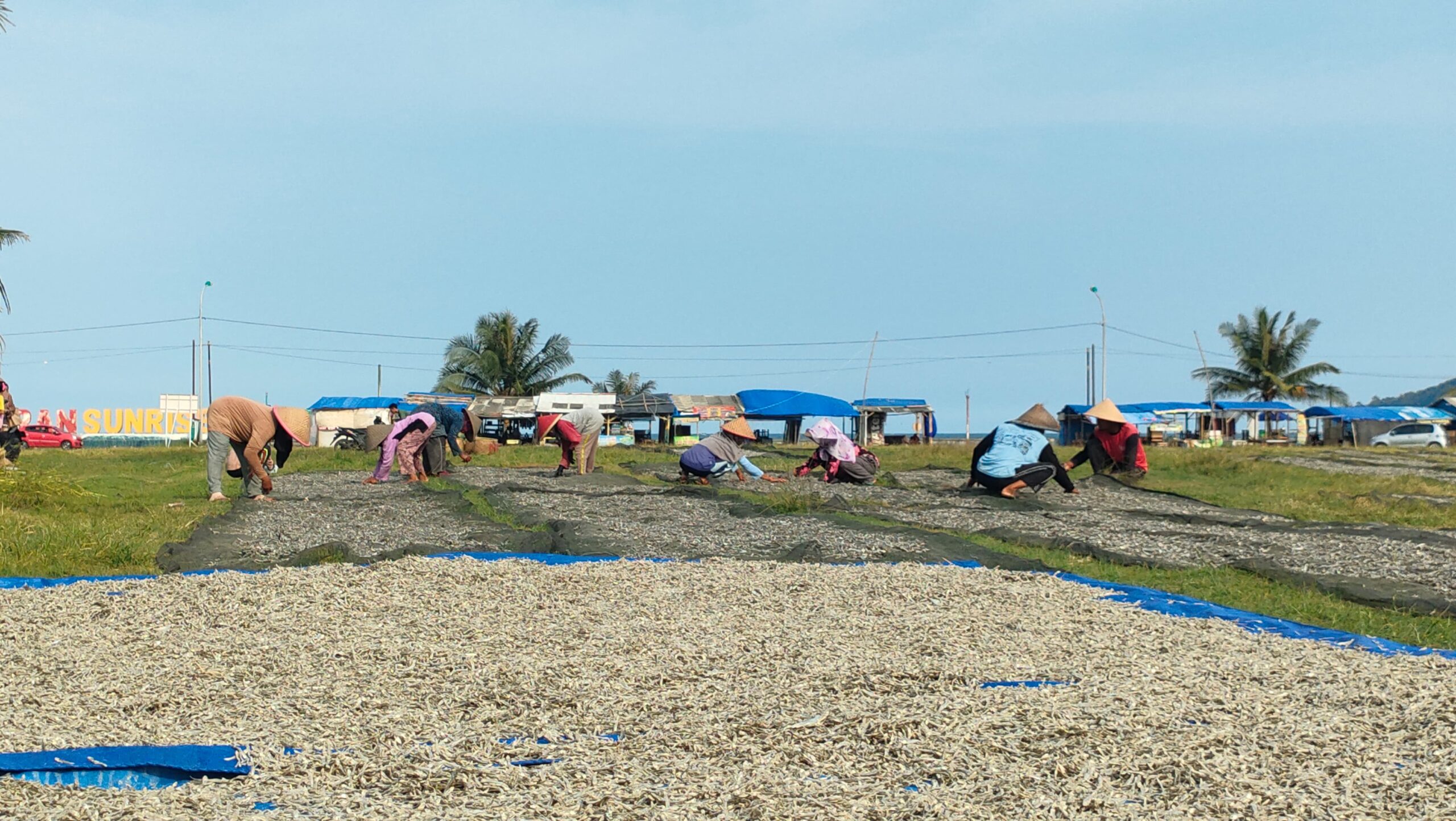 Setiap pagi hingga siang hari, para nelayan bersama keluarga mereka terlihat sibuk menjemur ikan teri yang baru ditangkap. Proses ini dilakukan secara tradisional, dengan menebar ikan teri di atas jaring atau para-para bambu yang dibentangkan di area lapang yang terpapar sinar matahari langsung.