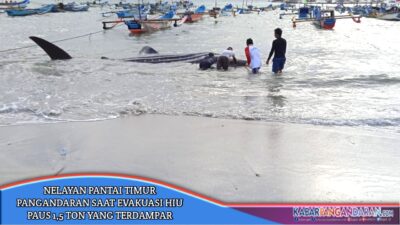 PANGANDARAN-Nelayan di Pantai Timur Pangandaran sekitar pukul 07.00 WIB berhasil mengevakuasi se ekor ikan Hiu…