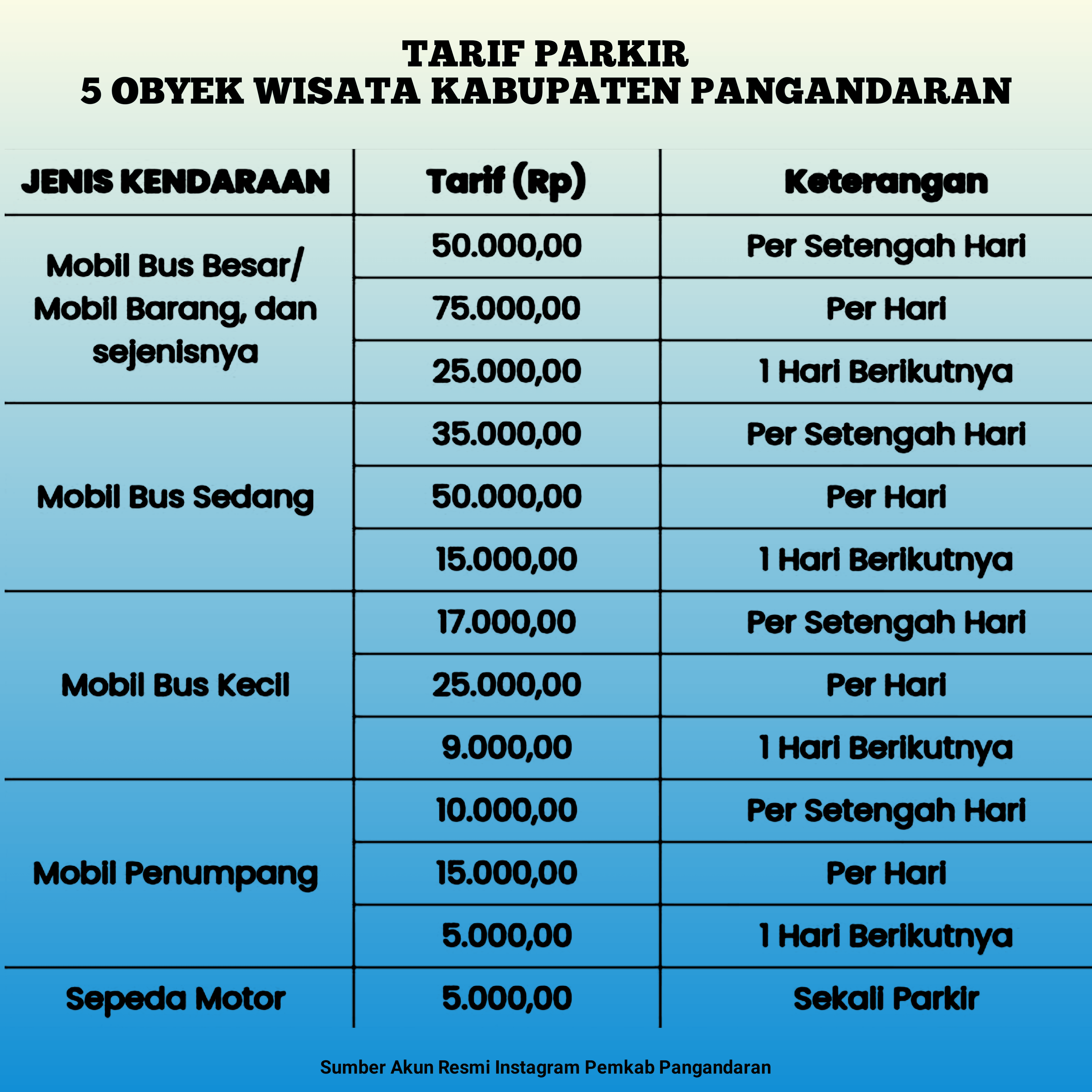 Berikut adalah rincian tarif parkir di 5 obyek wisata Kabupaten Pangandaran: