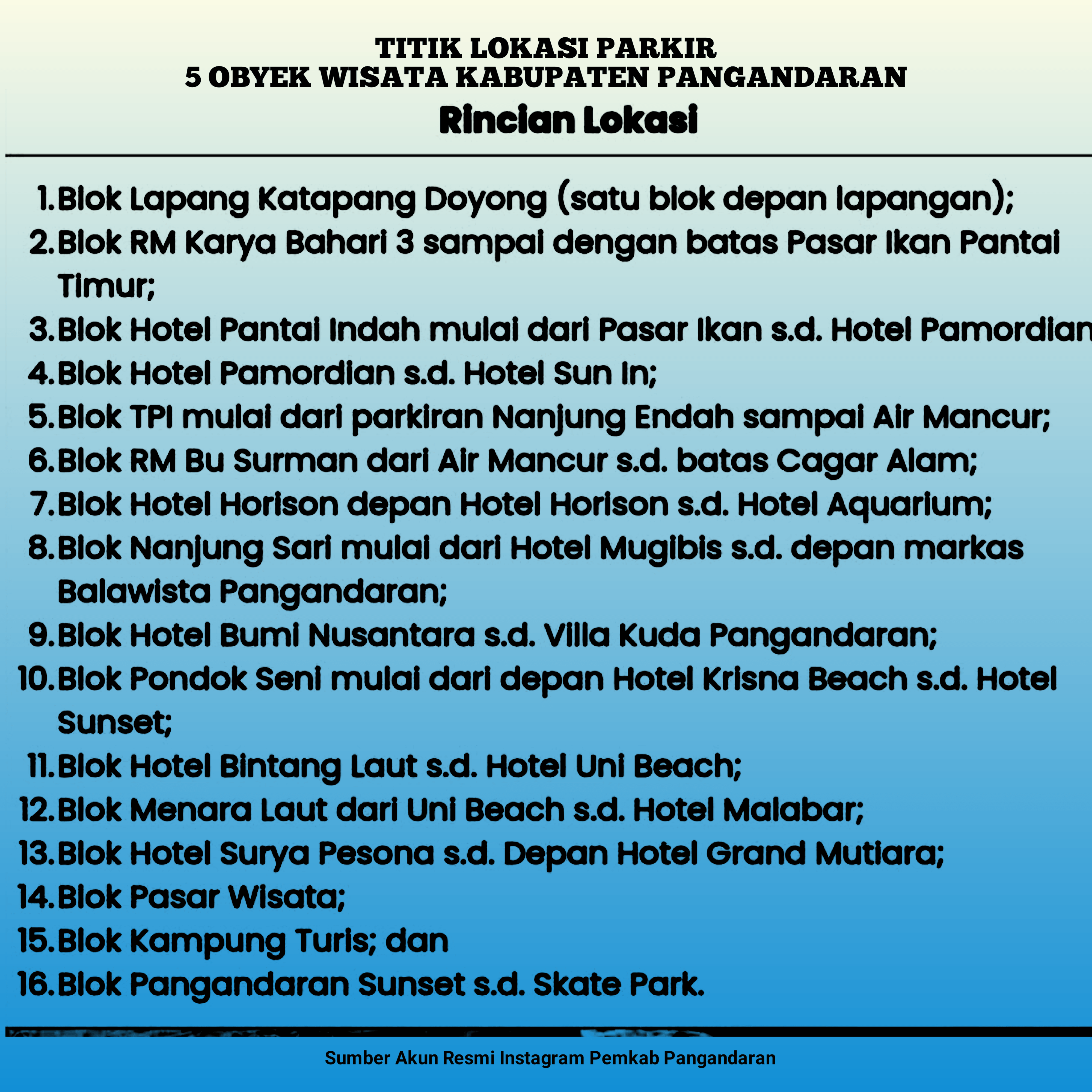 Mengutip informasi dari akun Instagram resmi Pemerintah Kabupaten Pangandaran, tarif dan titik lokasi parkir ini berlaku di lima obyek wisata utama, yaitu Pantai Karapyak, Pantai Pangandaran, Pantai Batu Hiu, Pantai Batu Karas, dan Destinasi Wisata Green Canyon Cijulang.