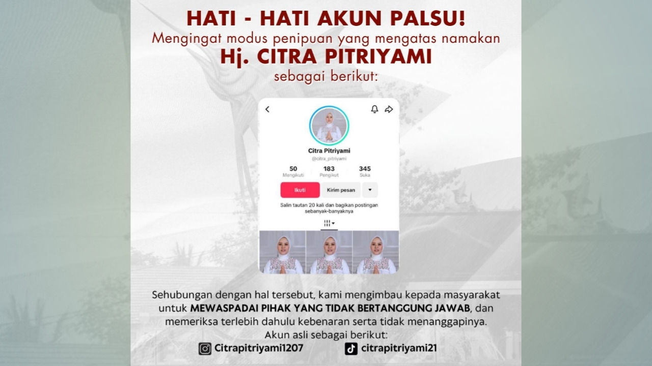 Kasubag Dokpim Prokopim Setda Kab Pangandaran Galih Avomegi membenarkan bahwa telah terjadi penipuan yang mengatasnamakan akun media sosial Bupati Pangandaran Citra Pitriyami.